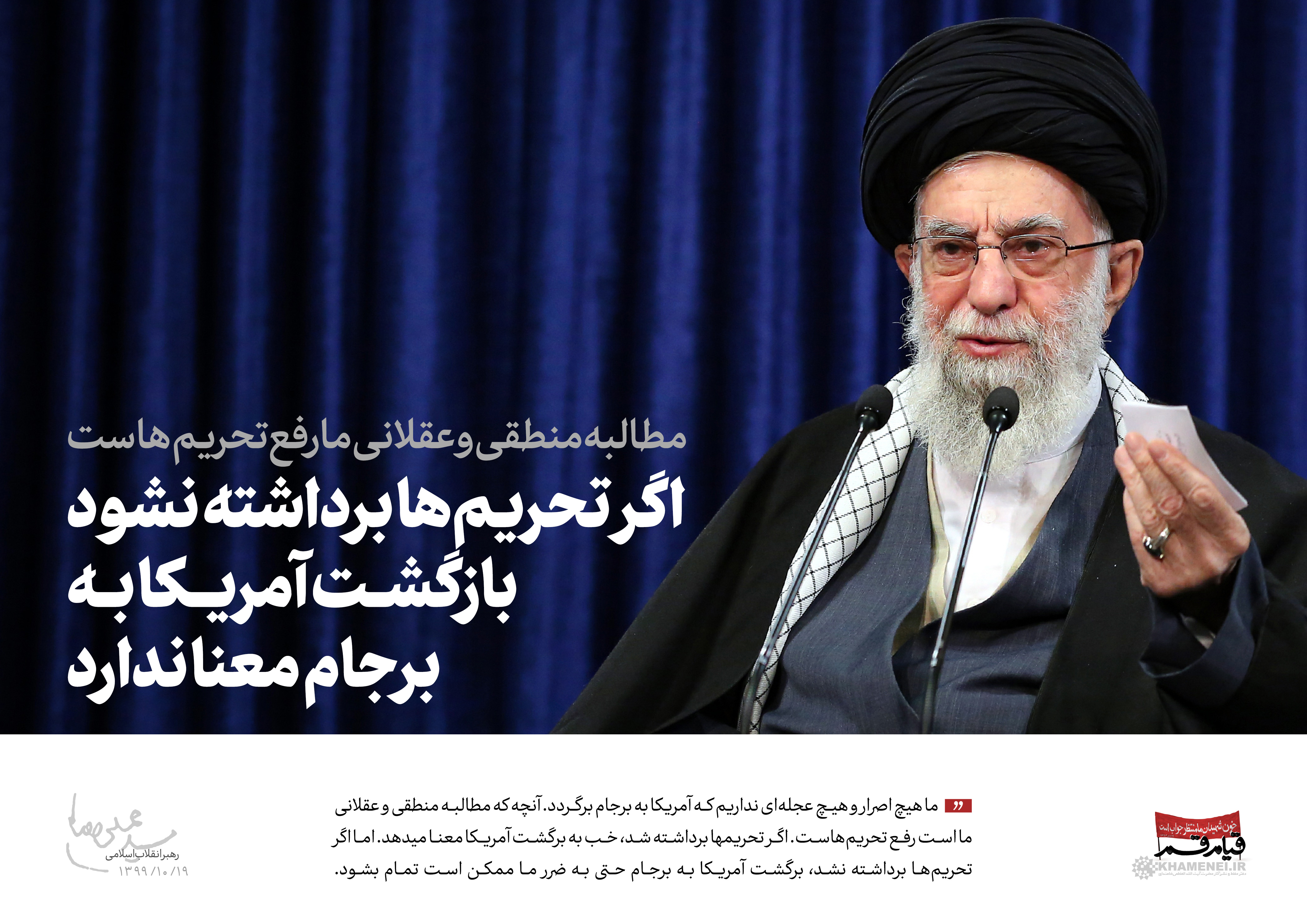 نکتهی اوّل این است که بحث میکنند که آمریکا برگردد به برجام یا برنگردد. ما هیچ اصراری نداریم، هیچ عجلهای نداریم که آمریکا به برجام برگردد؛ اصلاً مسئلهی ما این نیست که آمریکا به برجام برگردد یا برنگردد. آنچه مطالبهی منطقی ما و مطالبهی عقلانی ما است، رفع تحریمها است؛ تحریمها باید برداشته بشود. این حقّ غصبشدهی ملّت ایران است؛ چه آمریکا، چه اروپا -که آویزان به آمریکا و دنبالهروِ آمریکا است- وظیفه دارند این حقّ ملّت ایران را اداء کنند. اگر تحریمها برداشته شد، خب آن برگشت آمریکا به برجام معنایی خواهد داشت -البتّه مسئلهی خسارتها هست که جزو مطالبات ما است و در مراحل بعدی دنبال خواهد شد- امّا اگر چنانچه تحریمها برداشته نشد، برگشت آمریکا به برجام ممکن است حتّی به ضرر ما تمام بشود؛ به نفع ما که نیست، [بلکه] به ضرر ما هم ممکن است باشد. البتّه بنده به مسئولین، هم در قوّهی مجریّه و هم در قوّهی مقنّنه، گفتهام که در این زمینهها با دقّت و رعایت کامل ضوابط پیش بروند و عمل کنند.